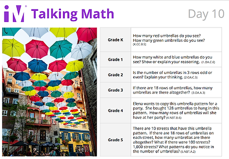 Teachers’ Editions of math textbooks often present lesson plans that are way too complicated, cover too much territory, and take too much time to teach. The beauty of IM Talking Math is that it’s simple, takes only 5 to 10 minutes, provides a visual context for using language, and helps students think critically about mathematics. It’s simple without simplifying the math. I think it’s a winner.