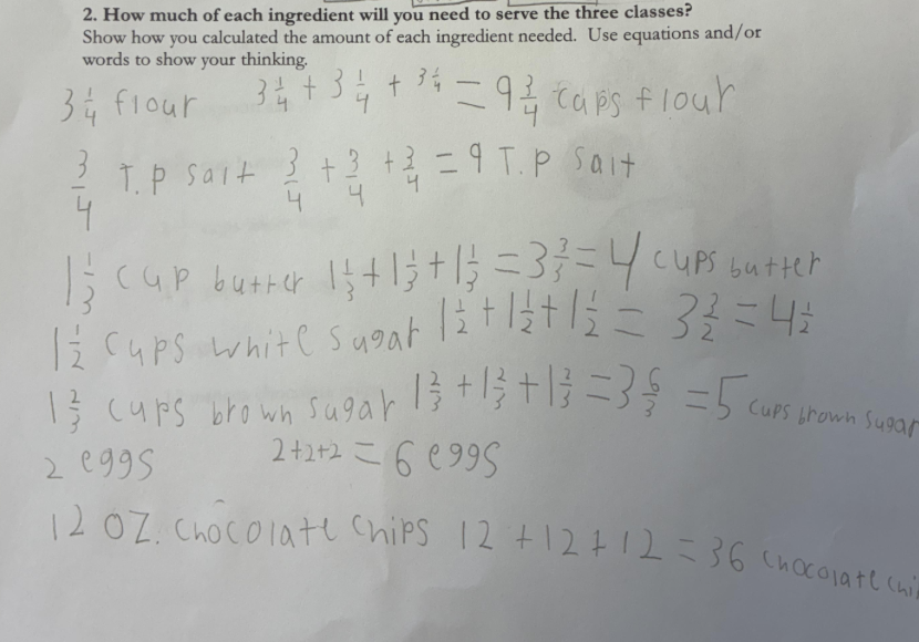 I like this problem for several reasons, most importantly because students can relate to the context. When we asked them if they’d ever baked cookies before, almost everyone’s hand raised. I also like this word problem because it’s naturally differentiated and accessible. Students can solve it using addition or multiplication, and if they only want to triple some of the ingredients rather than all of them, they can.