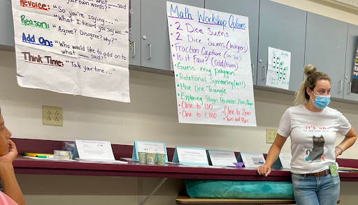 Teachers manage a Math Workshop by shifting their role from direct instruction to a facilitator and manager. After introducing the task choices for the day, the teachers during the Math Mania week circulated throughout the room, monitoring students to make sure they stayed engaged, used materials appropriately, and treated one another with respect. Teachers found themselves free to move from group to group and individual to individual, formatively assessing students’ thinking. But the most important role for the teachers was to ask good questions that encourage mathematical thinking.