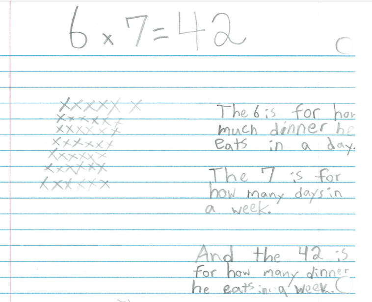- Will students show that they know what the numbers mean? For example, what do the 7 and the 6 stand for? What does the 42 represent? What story is the equation 7 x 6 telling us?