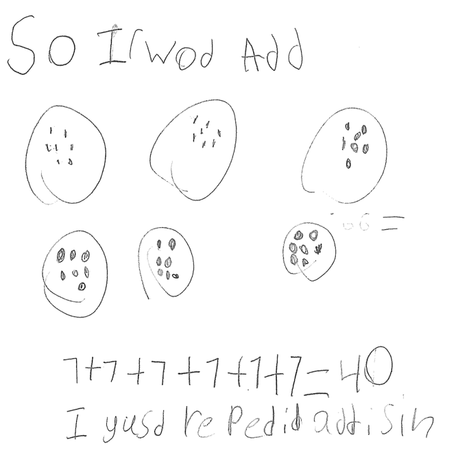 Even when we notice that a student struggles, we can still look for and appreciate their strengths and then guide them to their next steps. We can see that this student’s accuracy is off (but close), and their representation of the problem is six groups of seven rather than seven groups of six. But they can represent the problem using a set model and an equation, and they let us know in writing that they used repeated addition. This isn’t a “low” student, they are just on their own learning trajectory.