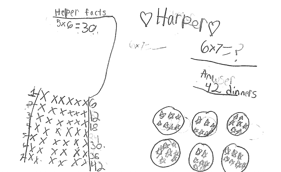 This student kept a running total, adding six dinners until she got to forty-two. Her writing describes multiplication in words, “I added 6 dinners seven times because there are seven days in a week.”