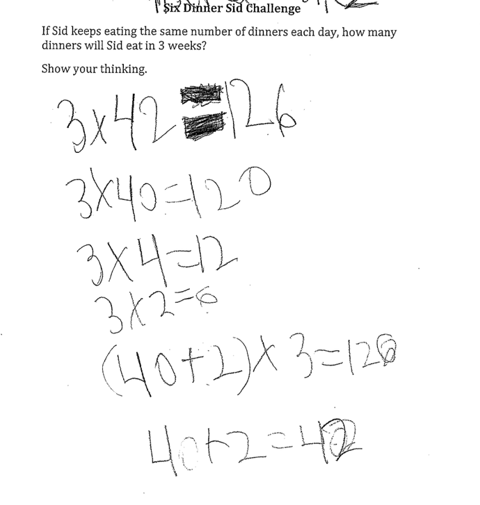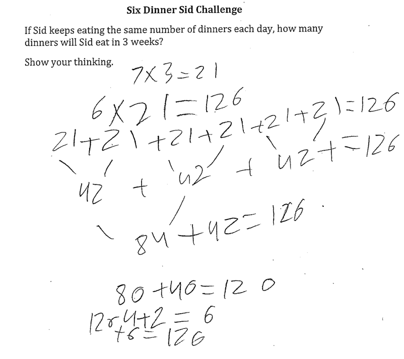 When I finish the book, I ask the question: If Sid eats six dinners a day, how many dinners will he eat in a week? I then ask the class to think about it and share with a partner how they might get started. Then I give them a blank piece of paper and they go to work.