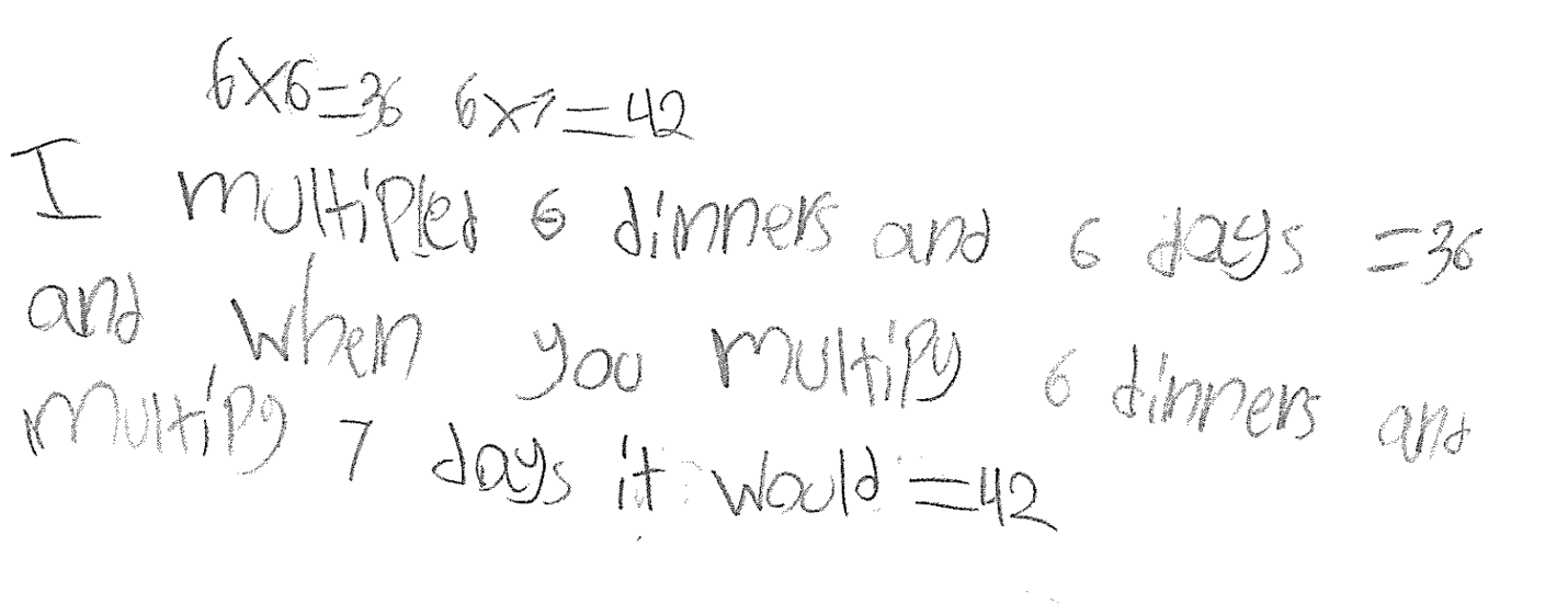 This student kept a running total, adding six dinners until she got to forty-two. Her writing describes multiplication in words, “I added 6 dinners seven times because there are seven days in a week.”