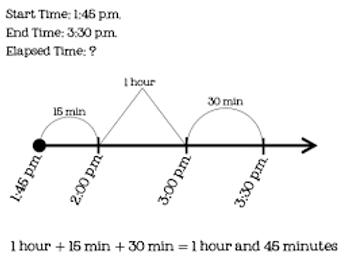 Another idea is to have students choose one of the activities on their storyboard and model how to figure out how much time has elapsed using an open number line. A number line is a useful tool when trying to figure out the distance (or passage of time) between two numbers (or times). One nice thing about an open number line is that there are many different ways to move back and forth. To model how to use an open number line to show elapsed time, I suggest that you begin by showing students an example and ask them what they notice: