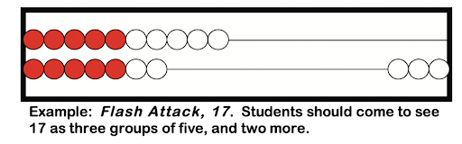 Here’s how it works. You quickly show students some beads on a Rekenrek, and the students’ job is to tell you how many beads they see. It’s like quick images, but with a Rekenrek. Following is an example of Flash Attack! showing students 17 beads: