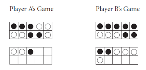 The game helps students “see” groups of numbers, engages them in counting to 20 and beyond, and gives them practice building teen numbers. Here’s a picture of two players’ double-ten frames after finishing a game: