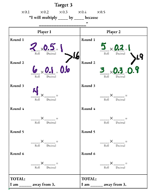 - Strategic Thinking: The requirement of having to use all 6 rolls demands strategic thinking. Some students like to start small, multiplying the roll by 0.1 or 0.2, pacing themselves across 6 rolls. Others like to start big, multiplying the first rolls by the larger decimal numbers and then go small in the end. The fact that players can go over 3 wholes also adds an interesting element to students’ decisions. Strategic thinking is accessible to all students in this game by virtue of the physical manipulatives.