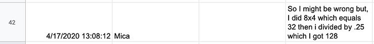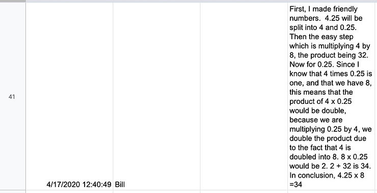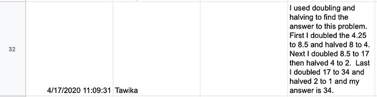 Below are some samples of student strategies from an asynchronous number talk that I did back in early April. The problem was: 4.25 x 8.