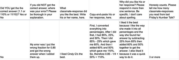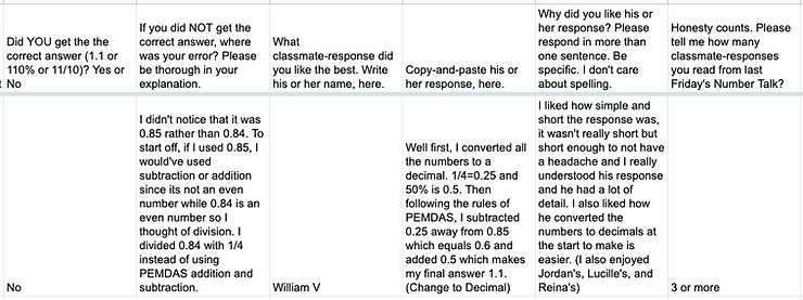 My students were comfortable with Google Forms, therefore I chose to use Forms as a vehicle for asynchronous number talks. I decided to use an asynchronous format because, at the time, I was unfamiliar (and assumed students were, too) with video-meeting applications like Zoom. My instinct was also that students would generally be apprehensive sharing-out in a video format and that the shy, quiet kids would be even more overshadowed by the more extroverted and talkative students in that setting than they would in the classroom. It took me a few weeks of trial and error, but I eventually found a format and process that produced an asynchronous number talk experience that exceeded any prior expectations. Of course, like everything, the format and process of this asynchronous number talk will continue to evolve and improve. My hope is also that I can have input and suggestions from the math-educator/learner community.