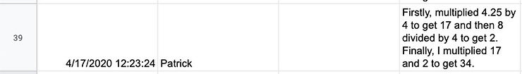 I set up the Google Form so student submissions would go to a Google Sheet. During day one, as students were submitting responses, I would check the spreadsheet every hour-or-so, eager to see how my students were thinking about the problem. I was thrilled that students who were normally quiet and reluctant to share their thinking in class were writing wonderful, insightful explanations. Students were applying strategies that I hadn’t anticipated to solve the problem in simple, efficient ways.
