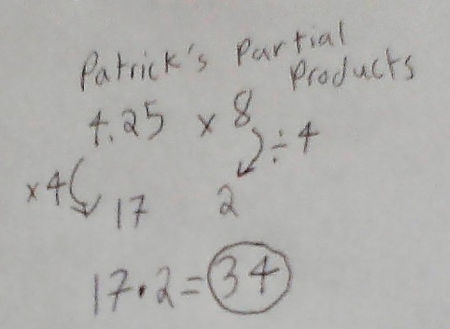 Patrick used a variation of “doubling and halving.” His explanation shows an intuitive sense of inverse proportionality, as he multiplied one of the factors by four, and then to compensate, divided the other factor by four. This created a more manageable multiplication problem for him.