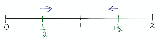 Students have to generate rational numbers. For example, if a student guesses one-half, I mark one-half on the number line (or you can have the student place it) and then I say, “My number is greater than one-half.” Below is what it would look like after two student guesses.