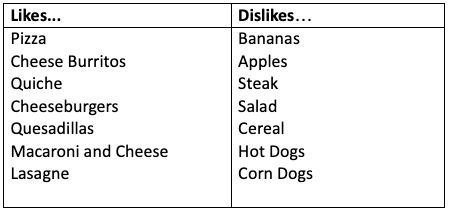 Here’s what the t-chart looked like about half-way through a game I played with a group of fifth graders. Can you guess what Mr. Picky Food’s rule is?
